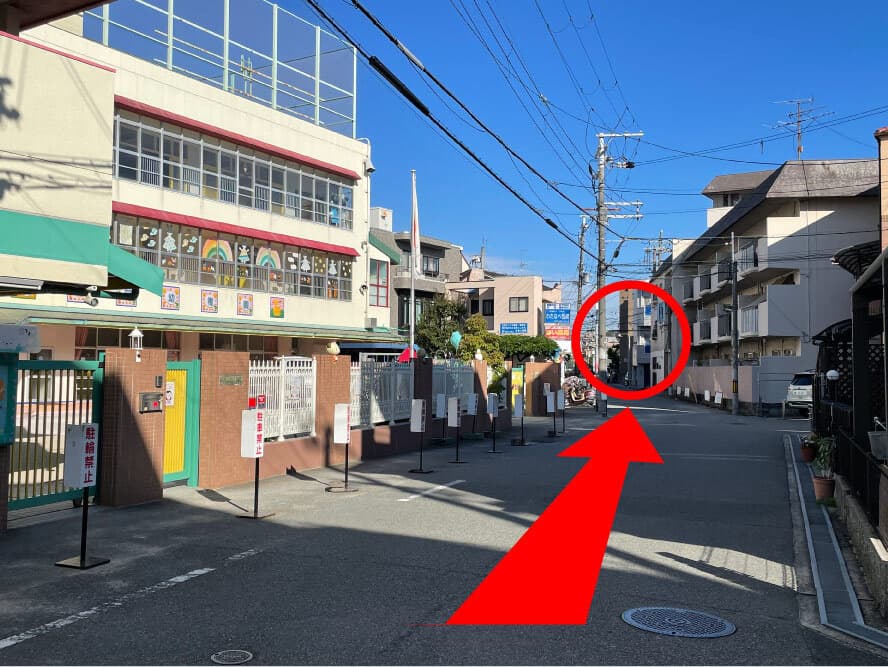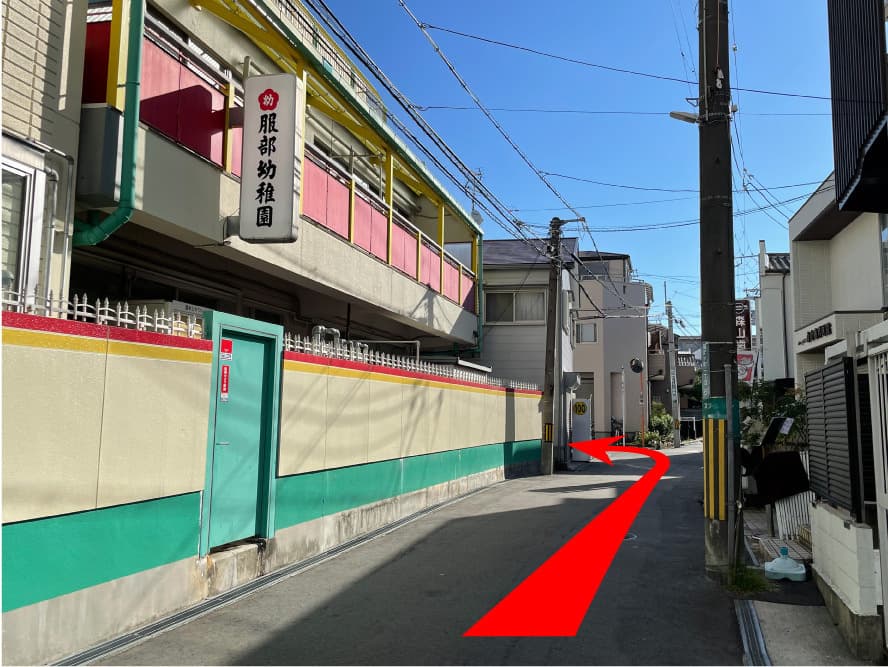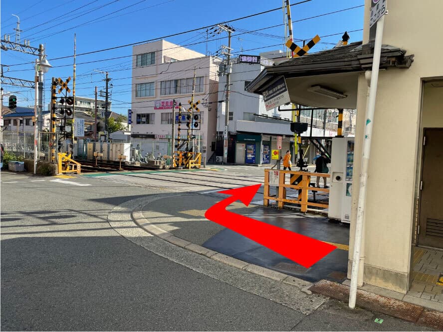 ①服部天神駅前方改札を出て、右手踏切を渡り直進