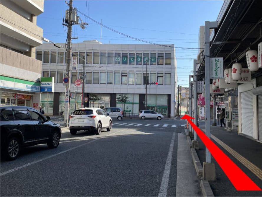 ②前方に見えるりそな銀行の右側道路をさらに直進